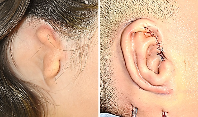 - Δεύτερον, το υγιές αφτί έχει ολοκληρώσει, σχεδόν, την ανάπτυξή του, οπότε συνιστά ασφαλή οδηγό ώστε να δοθεί το σωστό μέγεθος στο νέο πτερύγιο.