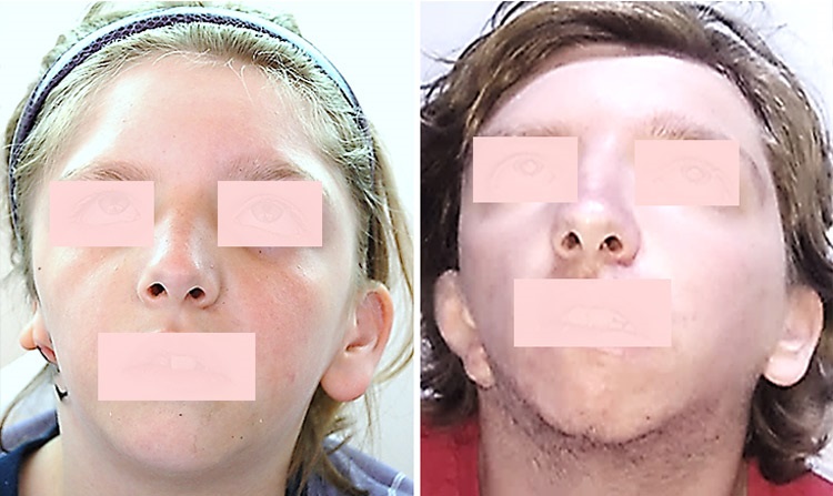 Εικ. 5, 6. Δεξιά κρανιοπροσωπική μικροσωμία και αποτέλεσμα στα 10 χρόνια μετά την αποκατάσταση του δύσμορφου πτερυγίου.