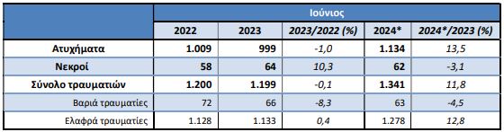 Από τα παθόντα πρόσωπα, καταγράφηκαν 62 νεκροί, 63 βαριά τραυματίες και 1.278 ελαφρά τραυματίες, έναντι 64 νεκρών, 66 βαριά τραυματιών και 1.133 ελαφρά τραυματιών τον Ιούνιο του 2023, παρουσιάζοντας μείωση κατά 3,1% σε νεκρούς και κατά 4,5% σε βαριά τραυματίες και αύξηση κατά 12,8% σε ελαφρά τραυματίες.