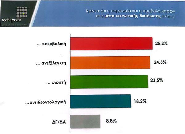Οι 607 γιατροί οι οποίοι συμμετείχαν στην ετήσια έρευνα του Ιατρικού Συλλόγου Θεσσαλονίκης, που παρουσιάστηκε την Τρίτη, ρωτήθηκαν μεταξύ άλλων για το πώς βλέπουν την παρουσία και την προβολή γιατρών από τα Μέσα Κοινωνικής Δικτύωσης. Στην μεγάλη τους πλειοψηφία οι τοποθετήσεις ήταν αρνητικές: Το 25,2% έκανε λόγο για υπερβολική έκθεση, το 24,3% για ανεξέλεγκτη, ενώ το 18,2% έθεσε θέμα δεοντολογίας. Στον αντίποδα, το 23,5% έκρινε πως δεν υπάρχει κάτι αρνητικό, ενώ το 8,8% δεν πήρε θέση.