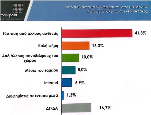 Πάντως, οι ασθενείς φαίνεται να επιμένουν ακόμη σε πιο «παραδοσιακούς» τρόπους επιλογής του θεράποντα ιατρού τους. Όπως προκύπτει από τις απαντήσεις των ίδιων των γιατρών στην ίδια έρευνα, η σύσταση από άλλους ασθενείς εξακολουθεί να είναι το κύριο μέσο επιλογής γιατρού, με ποσοστό 41,8%, αν και αυτό παρουσίασε σημαντική υποχώρηση σε σχέση με το 69.7% της περσινής έρευνας. Ακολουθούν η καλή φήμη του γιατρού, η σύσταση από άλλους συναδέλφους, μέσω του Ταμείου, με την ενημέρωση από το internet να καταλαμβάνει την 5η θέση στην σειρά επιλογής, με ποσοστό 5,9%.