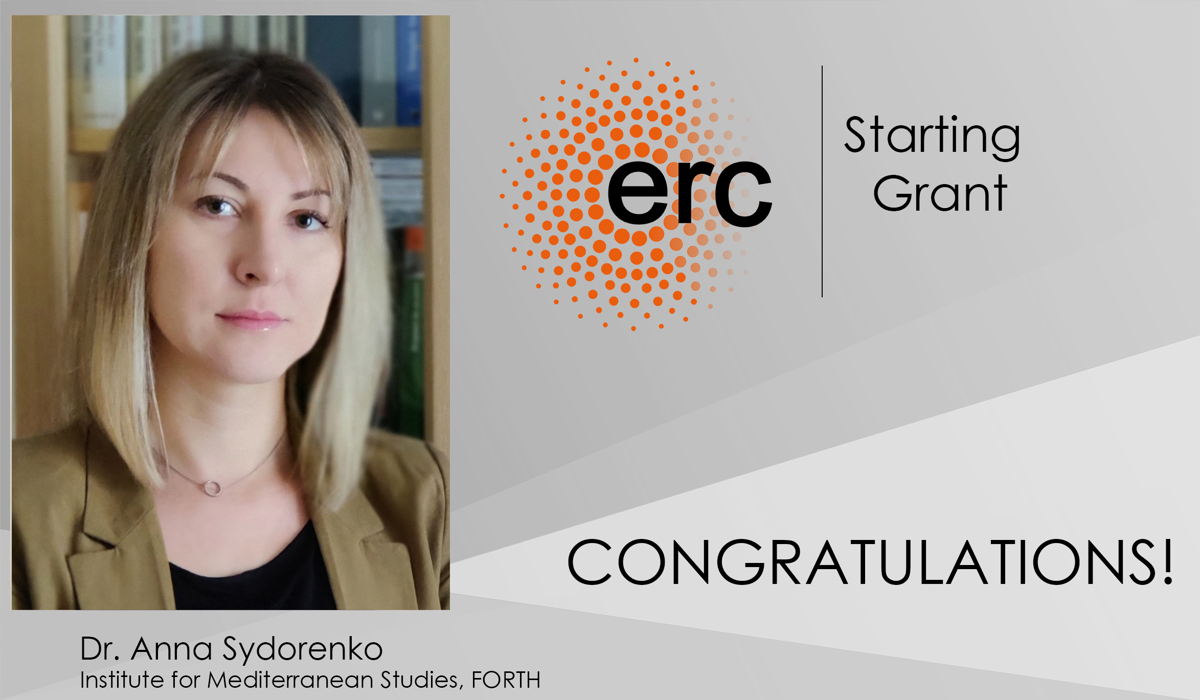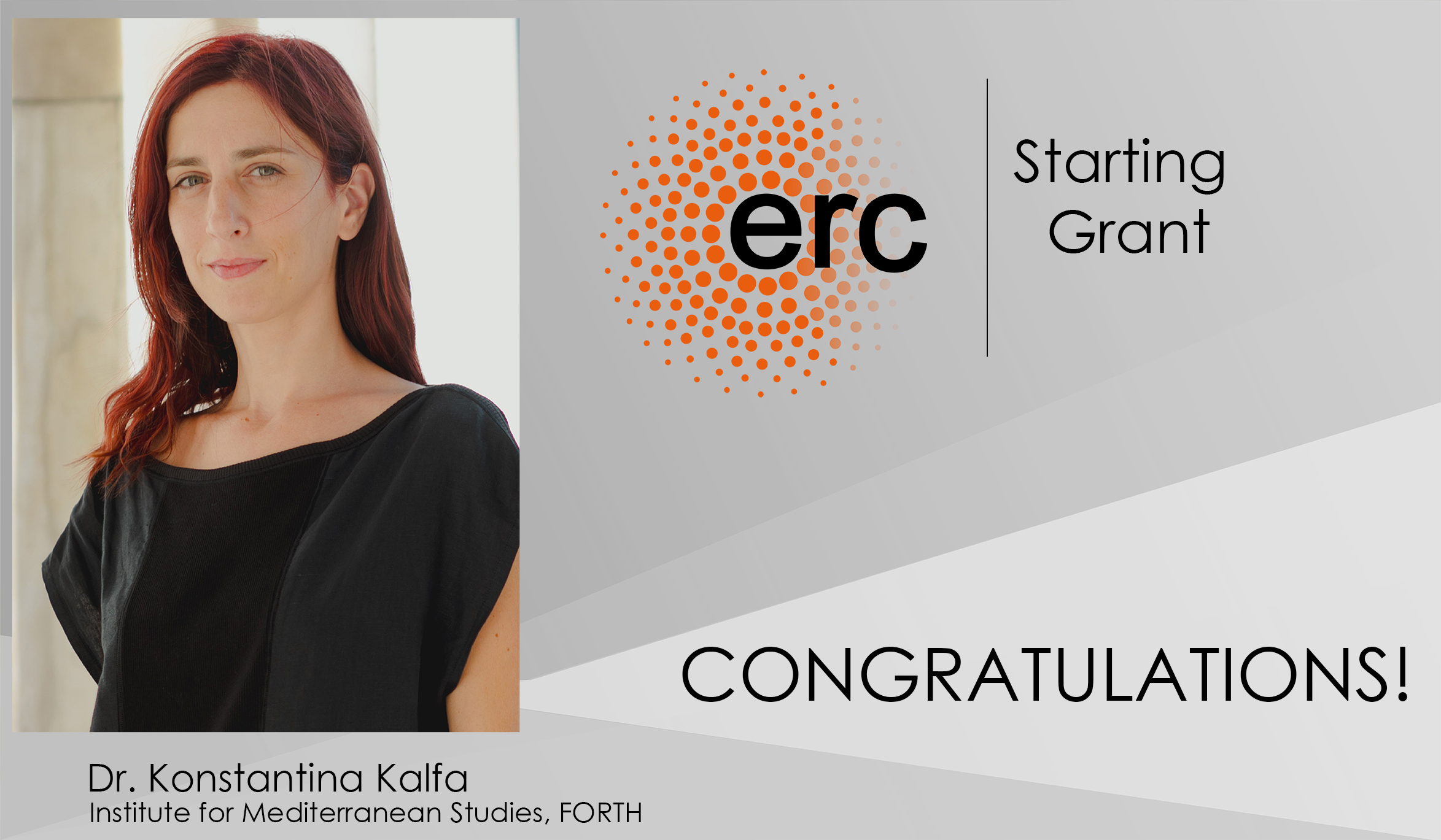 Σημαντικές επιχορηγήσεις από το Ευρωπαϊκό Συμβούλιο Έρευνας, ERC Starting Grants, συνολικού ποσού περίπου 3 εκ. ευρώ, έλαβαν οι μεταδιδακτορικές ερευνήτριες δρ Άννα (Γκάννα) Σιντορένκο και δρ Κωνσταντίνα Κάλφα, οι οποίες θα υλοποιήσουν την έρευνά τους στο Ινστιτούτο Μεσογειακών Σπουδών του Ιδρύματος Τεχνολογίας και Έρευνας. Αξίζει να σημειωθεί ότι από τα 494 έργα που χρηματοδοτήθηκαν, τα συγκεκριμένα δύο είναι τα μοναδικά ήρθαν στην Ελλάδα. Οι συγκεκριμένες χρηματοδοτήσεις του Ευρωπαϊκού Συμβουλίου Έρευνας είναι οι κορυφαίες της Ευρώπης και υποστηρίζουν νέους ερευνητές στην αρχή της καριέρας τους για να δημιουργήσουν τις δικές τους ερευνητικές ομάδες και να διεξάγουν πρωτοποριακή έρευνα σε όλους τους κλάδους.