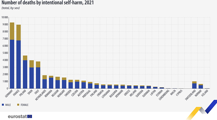 Αυτό προκύπτει από έκθεση της Eurostat που δημοσιεύτηκε σήμερα, με αφορμή την αυριανή Παγκόσμια Ημέρα Πρόληψης των Αυτοκτονιών και αφορά στοιχεία του 2021.