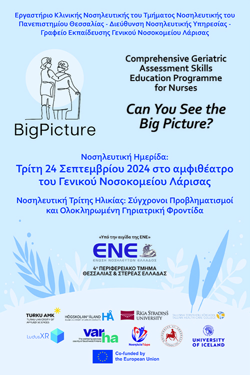 Το έργο "BigPicture" έχει ως κύριο στόχο την ανάπτυξη ενός νέου εκπαιδευτικού προγράμματος νοσηλευτικής για την Ολοκληρωμένη Γηριατρική Αξιολόγηση (ΟΓΑ), το οποίο θα προσφέρεται υπό τη μορφή μαθημάτων συνεχιζόμενης και δια βίου εκπαίδευσης και θα μπορεί να ενσωματωθεί στα προγράμματα σπουδών Ανώτατων Εκπαιδευτικών Ιδρυμάτων (ΑΕΙ), πανεπιστημίων και φορέων Επαγγελματικής Εκπαίδευσης και Κατάρτισης (ΕΕΚ).