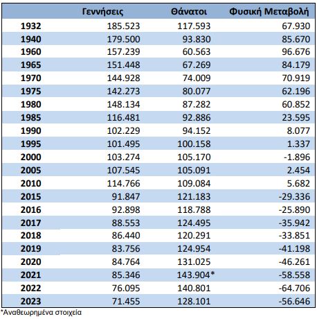 Σύμφωνα με στοιχεία της ΕΛΣΤΑΤ, που δημοσιοποιήθηκαν σήμερα, το 2023 καταγράφηκαν 71.455 γεννήσεις και 128.101 θάνατοι. Αυτό δίνει αρνητικό πρόσημο στη φυσική μεταβολή του πληθυσμού κατά 56.646 άτομα.