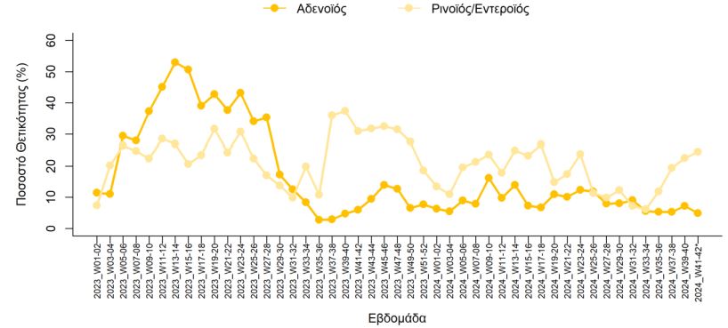 Όπως αναφέρεται στην επιδημιολογική έκθεση του ΕΟΔΥ για τις αναπνευστικές λοιμώξεις, από τα 102 δείγματα που εξέτασαν, τα 25 (25%) ήταν θετικά στον ρινοϊό και εντεροϊό. Το ακόλουθο γράφημα είναι ενδεικτικό.