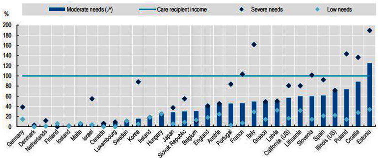 Κατά μέσο όρο, τα δημόσια συστήματα Υγείας των χωρών του ΟΟΣΑ καλύπτουν το 62% του συνολικού κόστους υπηρεσιών μακροχρόνιας φροντίδας για άτομα με μέτριες ανάγκες, που απαιτούν φροντίδα στο σπίτι έως 22,5 ώρες την εβδομάδα.