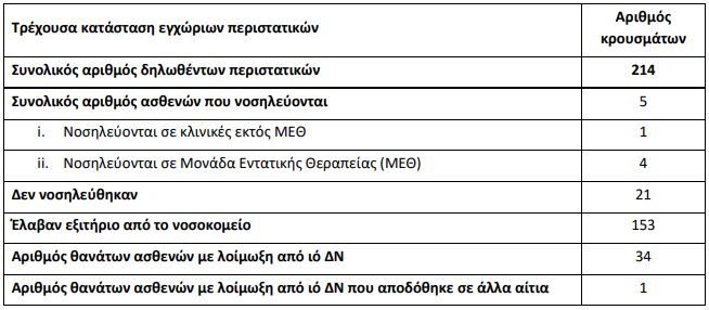 Όπως επισημαίνεται, ο συνολικός αριθμός των θανάτων ανέρχεται σε 34 και των κρουσμάτων σε 214.