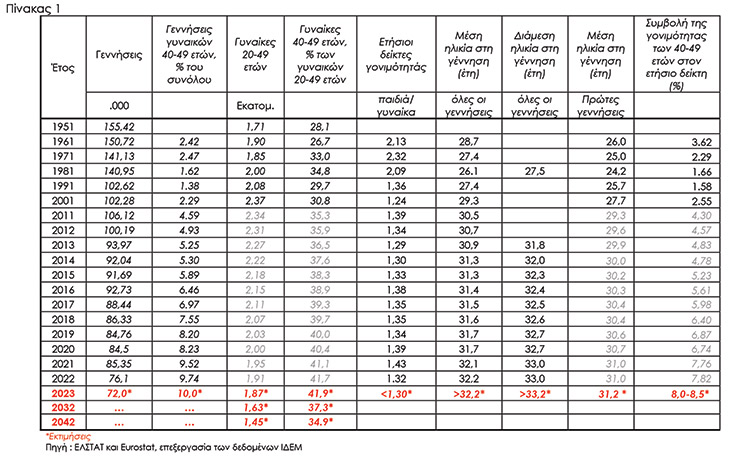 Οι πρόοδοι των τεχνικών υποβοηθούμενης γονιμότητας και η διευρυμένη πρόσβαση σε αυτές με την κάλυψη του κόστους τους δεν πρόκειται, ακόμη και αν συνεχιστεί η αύξηση της μέσης ηλικίας στην τεκνογονία, να οδηγήσουν τις δύο επόμενες δεκαετίες σε αύξηση των προερχομένων από γυναίκες 40 ετών και άνω γεννήσεων, καθώς το πλήθος των γυναικών των ηλικιών αυτών εν απουσία μετανάστευσης θα μειωθεί από 795 χιλ. το 2022 στις 600 χιλ. το 2032 και στις 500 χιλ. το 2042 (-37%).
