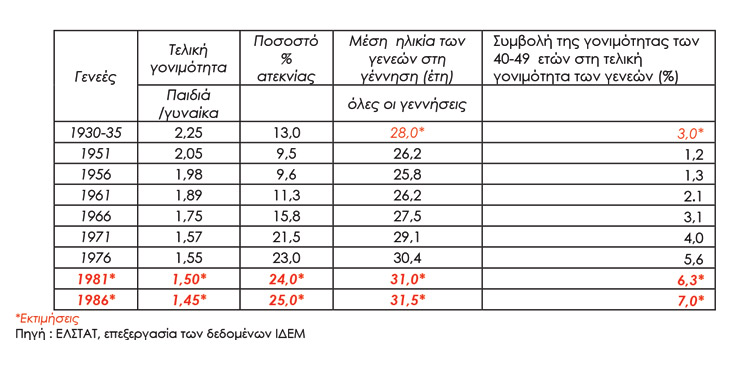 Η συνεχής αύξηση της μέσης ηλικίας και η διακύμανση των ετήσιων δεικτών μετά το 1984 σε επίπεδα χαμηλότερα του 1,5 παιδιά /γυναίκα, επίπεδα που υπολείπονται σημαντικά του «ορίου αναπαραγωγής» (των 2,05 δηλαδή παιδιών/γυναίκα που «απαιτούνται» για να μη μειωθεί μεσο-μακροπρόθεσμα, εν απουσία μετανάστευσης ο πληθυσμός μας) αποτυπώνουν έμμεσα και τη μείωση της τελικής γονιμότητας των γυναικών που γεννήθηκαν μετά το 1935.