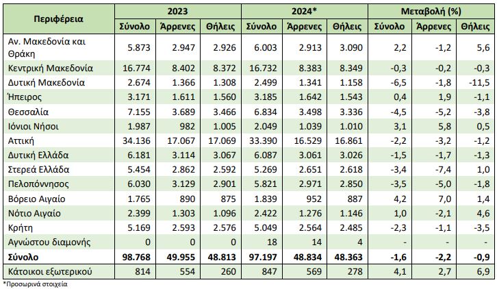 Όπως αναφέρεται σε έκθεση που δημοσιεύτηκε σήμερα, το συγκεκριμένο διάστημα υπήρξαν 97.197 θάνατοι (48.834 άνδρες και 48.363 γυναίκες), ενώ κατά το αντίστοιχο διάστημα του 2023 είχαν ανέλθει σε 98.768 (49.955 άνδρες και 48.813 γυναίκες), σημειώνοντας μείωση κατά 1.571 θανάτους (-1,6%).