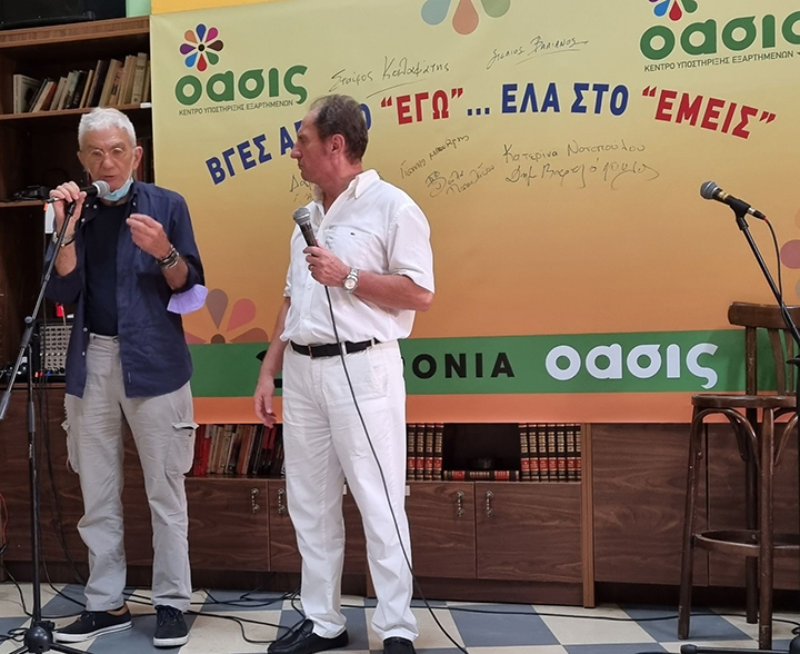 Με τον επικεφαλής του Κέντρου Απεξάρτησης, Δαμιανό Δουίτση, τον ένωναν κοινά βιώματα και παράλληλες διαδρομές βύθισης στον κόσμο των ψευδαισθήσεων και απόδρασης από αυτόν. Το 1992 επέστρεψαν ταυτόχρονα "καθαροί" από προγράμματα απεξάρτησης, ο πρώτος από την Αμερική, ο δεύτερος από την Αγγλία. Η συνάντησή τους στη Θεσσαλονίκη γέννησε μια μακροχρόνια σχεδόν συγγενική σχέση και πολλές κοινές δράσεις. Η γενναιότητα με την οποία μια προβεβλημένη διεθνώς προσωπικότητα μίλησε δημόσια για την αδυναμία του, συνέβαλε καθοριστικά στη διάδοση του μηνύματος για μια ζωή με νηφαλιότητα.
