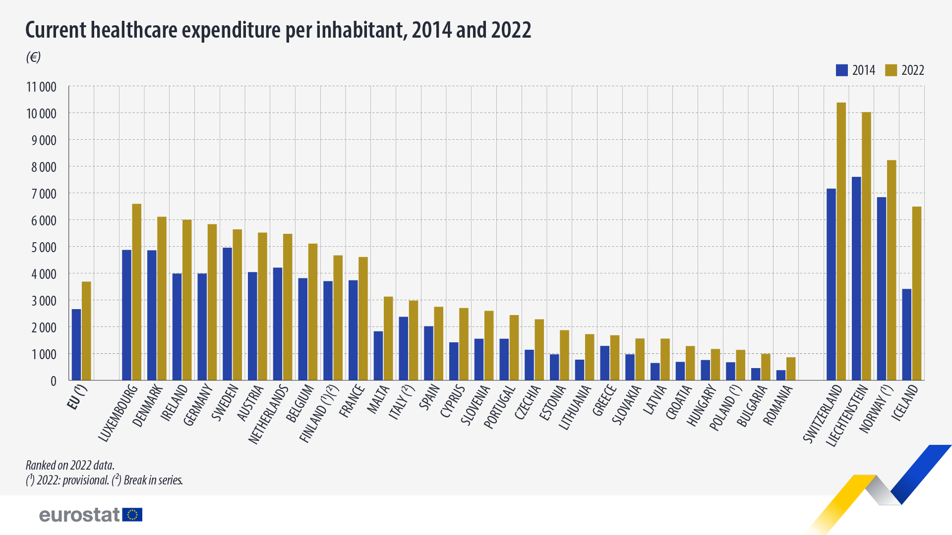 Οι δαπάνες για την υγειονομική περίθαλψη αυξήθηκαν σε όλες τις χώρες της ΕΕ από το 2014. Η Λετονία, η Λιθουανία και η Ρουμανία κατέγραψαν τις υψηλότερες σχετικές αυξήσεις - 140,5%, 125,6% και 123,1% αντίστοιχα - σε σύγκριση με το 2014.