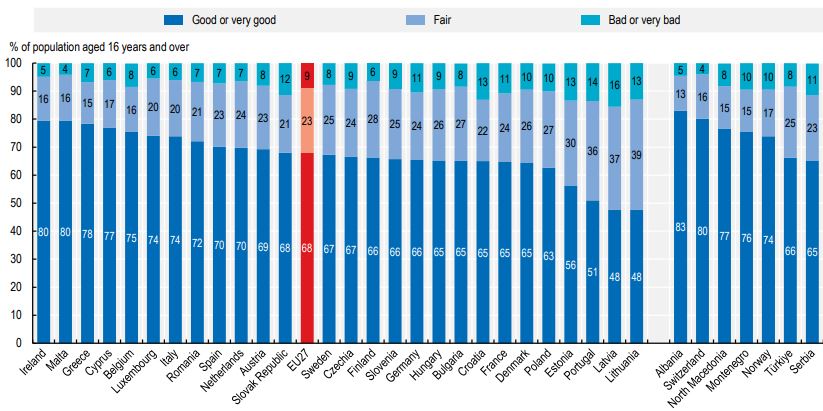 Το ποσοστό όσων δηλώνουν πως η υγεία τους είναι καλή, υπερβαίνει σημαντικά το μέσο ευρωπαϊκό ποσοστό (68%), ενώ εξίσου θετική για τη χώρα μας είναι η σύγκριση με όσους αναφέρουν κακή κατάσταση (μέσο ευρωπαϊκό ποσοστό 9%).