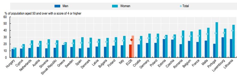 Σύμφωνα με τα στοιχεία, πάνω από το 20% των ατόμων ηλικίας 50 ετών και άνω έχουν συμπτώματα κατάθλιψης, με τις γυναίκες να πλήττονται περισσότερο. Η Ελλάδα κατέχει την έβδομη θέση στον πίνακα, με το μέσο ευρωπαϊκό ποσοστό να βρίσκεται κοντά στο 28%.