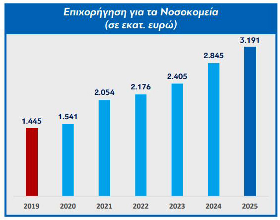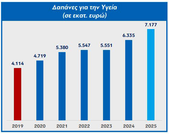 Σύμφωνα με παρουσίαση του υπουργείου Οικονομικών, την εξαετία 2019 - 2025 καταγράφηκε αύξηση των δαπανών για την Υγεία κατά 74,4% και κατά 120,8% για τα νοσοκομεία.