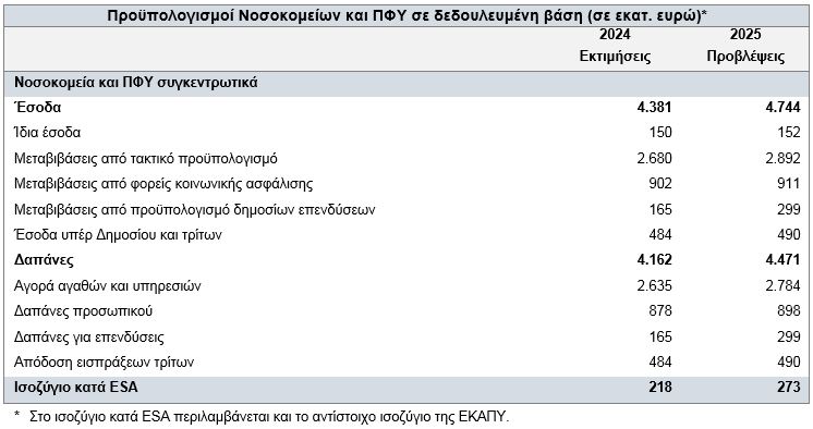 Το δημοσιονομικό αποτέλεσμα των νοσοκομείων και της ΠΦΥ προβλέπεται ότι θα διαμορφωθεί σε πλεόνασμα ύψους 273 εκατομμυρίων ευρώ, παρουσιάζοντας βελτίωση κατά 55 εκατομμύρια ευρώ σε σχέση με το αντίστοιχο εκτιμώμενο μέγεθος για το 2024.
