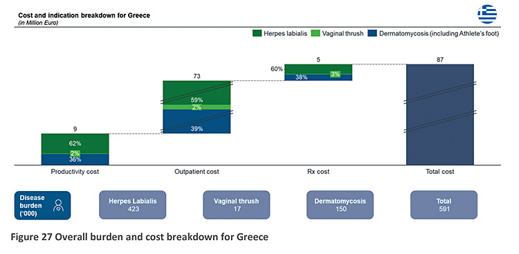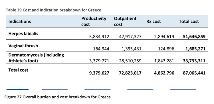 Ειδικότερα στην Ελλάδα, η συνολική οικονομική επιβάρυνση του επιχείλιου έρπητα, των κολπικών μυκητιάσεων και της δερματομυκητίασης (συμπεριλαμβανομένης της νόσου ''το πόδι του αθλητή'') είναι 87 εκατομμύρια ευρώ. Οι πίνακες παρέχουν την ανάλυση του κόστους, που απεικονίζει τον αντίκτυπο αυτών των συνθηκών στην παραγωγικότητα, τα έξοδα εξωτερικών ασθενών και το κόστος συνταγογράφησης.