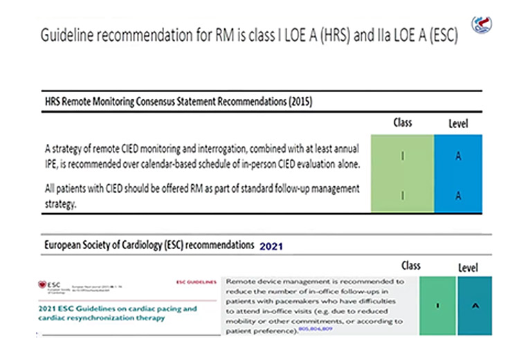Κατά την ομιλία της και αναφορικά με τις ενεργές εμφυτεύσιμες συσκευές, παρουσιάστηκαν οι κατευθυντήριες οδηγίες της Ευρωπαϊκής Καρδιολογικής Εταιρείας (European Society of Cardiology, ESC Recommendations 2021) οι οποίες κατηγοριοποιούν την τηλεπαρακολουθηση των ασθενών σε κλάση IA, ήτοι, “συστήνεται” ή “ενδείκνυται”, με την κατηγοριοποίηση να στοιχειοθετείται με βάση τα κλινικά αποτελέσματα όπως αυτά προκύπτουν από πολυκεντρικές τυχαιοποιημένες κλινικές μελέτες ή/και μετα-αναλύσεις.