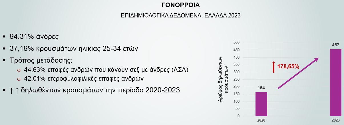 Πολύ μεγαλύτερη είναι η αύξηση των κρουσμάτων γονόρροιας, με το 94,31% να αφορά άνδρες. Το 37,19% των κρουσμάτων αφορά άτομα ηλικίας 25 - 34 ετών, ενώ το 44,63% αφορά επαφές ανδρών με άνδρες.