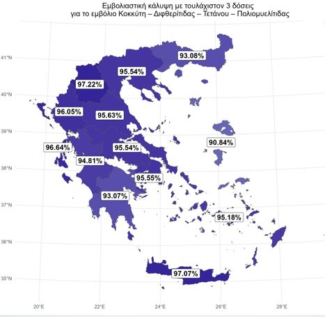 Τα χαμηλότερα ποσοστά κάλυψης παρατηρούνται στο Βόρειο Αιγαίο και τα υψηλότερα στη Δυτική Μακεδονία και στην Κρήτη.