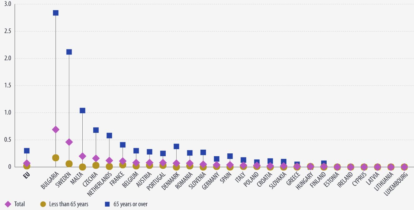 Η Βουλγαρία ανέφερε το υψηλότερο ποσοστό θανάτων (0,69 ανά 100.000) με την αναλογία να εκτινάσσεται στο 2,84 ανά 100.000 σε άτομα ηλικίας 65 ετών και άνω.