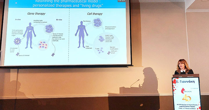 Οι προηγμένες θεραπείες έχουν επαναπροσδιορίσει το παραδοσιακό φαρμακευτικό μοντέλο, τόνισε η αιματολόγος διευθύντρια στο Αιματολογικό Τμήμα του "Γ. Παπανικολάου", συνεργάτις καθηγήτρια στο University of Washington, Ευαγγελία Γιαννάκη. "Το προηγμένο θεραπευτικό προϊόν δεν είναι ένα φάρμακο το οποίο παρασκευάζεται προτυποποιημένα και μαζικά, αλλά είναι εξατομικευμένο, προέρχεται από τον ασθενή, χρησιμοποιεί ως πρώτη ύλη τα κύτταρα του ασθενούς και επιστρέφει στον ίδιο", εξήγησε, προσθέτοντας πως "το φάρμακο είναι ζωντανό, διότι δεν είναι μια χημική ουσία η οποία θα μεταβολιστεί και θα απεκκριθεί, αλλά είναι κύτταρο, το οποίο παραμένει μακροπρόθεσμα στον οργανισμό και ασκεί τον ρόλο τον οποίο του ζητάμε να ασκήσει".