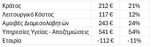 - Το προ φόρου ασφάλιστρο επιβαρύνεται με φόρο 15%, ενώ τα τιμολόγια στις υπηρεσίες υγείας των ιδιωτικών επιχειρήσεων επιβαρύνονται με ΦΠΑ 24%, που είναι κόστος για τις Ασφαλιστικές εταιρίες, αφού το ασφαλιστικό προϊόν δεν υπάγεται στο καθεστώς ΦΠΑ. (Ο ΦΠΑ καταγράφεται στα στοιχεία της ΕΑΕΕ στις αποζημιώσεις και αφορά, σύμφωνα με την ανακοίνωσή της Ένωσης, περίπου σε 20% των ποσών, που καταβάλλονται για υπηρεσίες στους επιχειρηματικούς ιδιωτικούς φορείς). Εδώ, το κόστος αυτό, εκτιμημένο στο 15% - αφού υπάρχουν και υπηρεσίες που δεν παρέχονται σε τέτοιους φορείς - μεταφέρεται στο τμήμα του ασφαλίστρου που αναλογεί στο Κράτος. Αυτά μαζί, φέρουν το Κράτος να εισπράττει το 21% του τελικού ασφαλίστρου, που πληρώνει ο καταναλωτής.