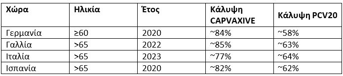 Σύμφωνα με επιδημιολογικά δεδομένα από τέσσερις χώρες της ΕΕ, το CAPVAXIVE καλύπτει μεγαλύτερο ποσοστό περιστατικών διεισδυτικής πνευμονιοκοκκικής νόσου σε σύγκριση με το PCV20: