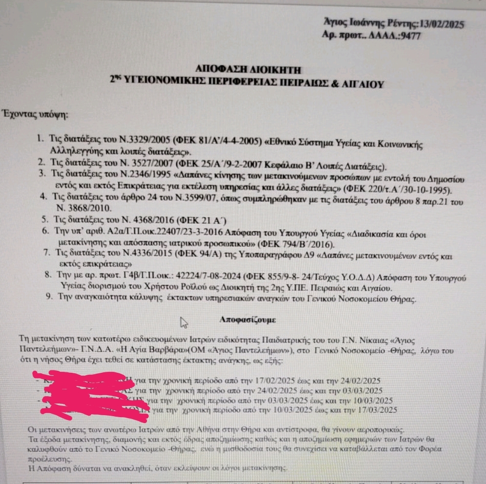 "Αργά το μεσημέρι της Πέμπτης 13/2/25, αιφνιδιαστικά και απροειδοποίητα ο διοικητής της 2 ης ΥΠΕ απέστειλε απαράδεκτο έγγραφο με το οποίο 'διατάζει' ειδικευόμενους γιατρούς του Παιδιατρικού τμήματος του Γ.Ν Νίκαιας να μετακινηθούν στη Σαντορίνη για να αναλάβουν καθήκοντα ειδικευμένου Παιδίατρου, καθώς εκεί ως γνωστόν ειδικευμένος Παιδίατρος δεν υπάρχει.