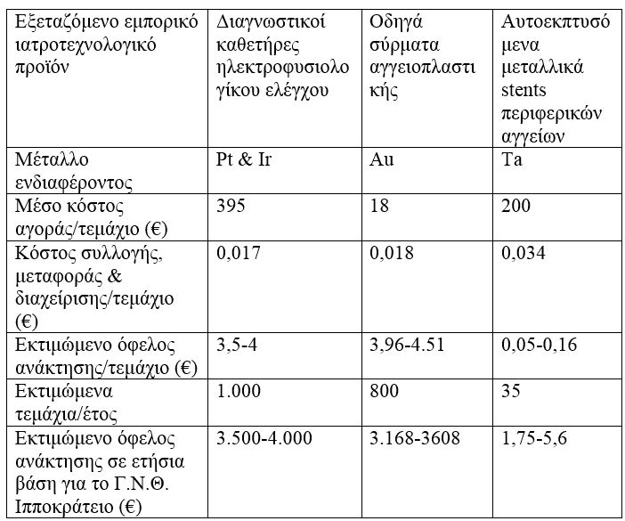 Βάσει του εκτιμώμενου οφέλους, όπως αυτό παρουσιάζεται στον παρακάτω Πίνακα, το Γ.Ν.Θ. Ιπποκράτειο (και αντιστοίχως και άλλα νοσοκομεία της χώρας παρόμοιας δυναμικότητας), θα μπορούσε μέσω της ανάκτησης των πολύτιμων μετάλλων που περιέχουν μόνο τα τρία εξεταζόμενα εμπορικά είδη, να επιτύχει μία μείωση του ετήσιου κόστους για τη συλλογή, μεταφορά και διαχείριση των ΕΑΑΜ του της τάξης του 1%.