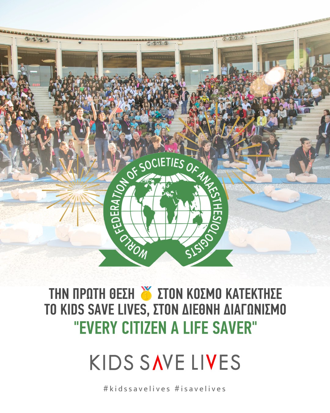 Την πρώτη θέση στον κόσμο κατέκτησε η ανθρωπιστική οργάνωση Kids Save Lives – Τα Παιδιά Σώζουν Ζωές στον διεθνή διαγωνισμό «Every Citizen a Life Saver» της Παγκόσμιας Ομοσπονδίας Αναισθησιολόγων WFSA - World Federation Of Societies of Anaesthesiologists.