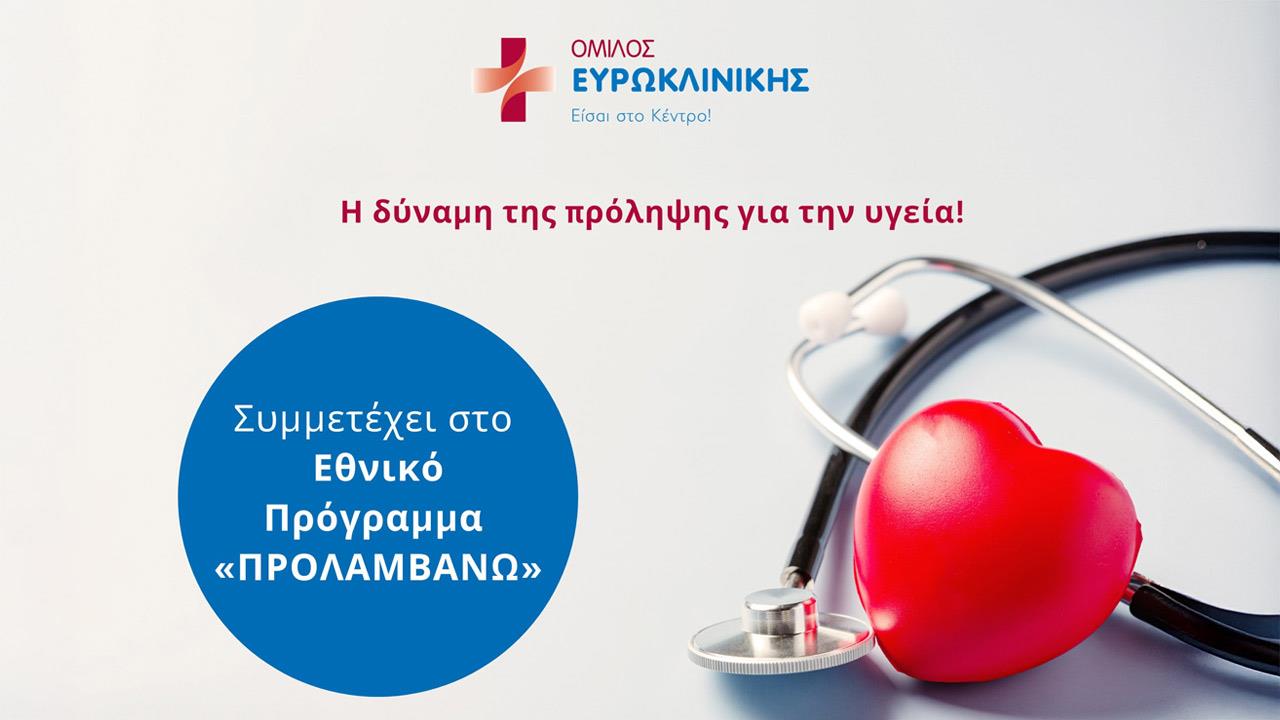 Ο Όμιλος Ευρωκλινικής ενισχύει τη σημασία της πρόληψης συμμετέχοντας στο Εθνικό Πρόγραμμα «ΠΡΟΛΑΜΒΑΝΩ» για την πρόληψη και αντιμετώπιση των Καρδιαγγειακών Κινδύνων, την πρόληψη κατά του Καρκίνου του Τραχήλου της Μήτρας και την πρόληψη κατά του Καρκίνου του Μαστού.