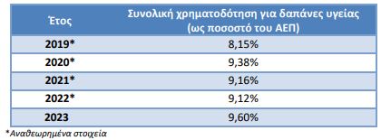 Όπως προκύπτει από τα στοιχεία, η συνολική χρηματοδότηση της Υγείας εμφάνισε αύξηση, φτάνοντας στο 9,6%, από 8,15% το 2019.