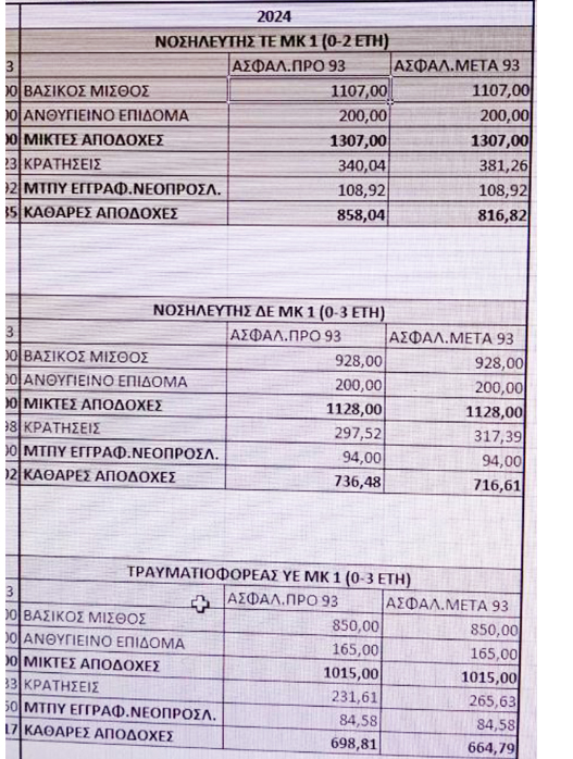 Ο τραυματιοφορέας λαμβάνει 664,79 ευρώ τον μήνα, ο ΔΕ Βοηθός νοσηλευτή 716,61 ευρώ και ο ΤΕ Νοσηλευτής 816,82 ευρώ.