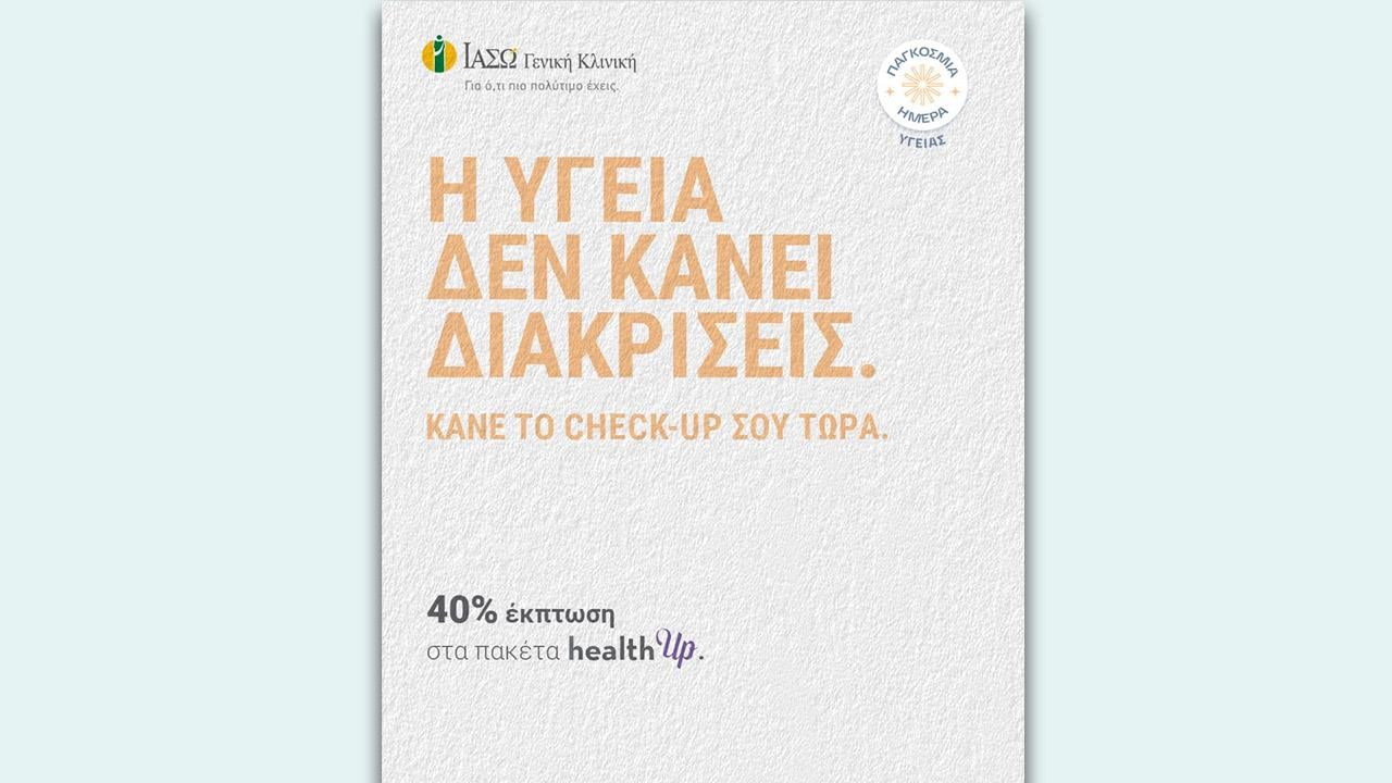 Το ΙΑΣΩ Γενική Κλινική γιορτάζει την Παγκόσμια Ημέρα Υγείας και προσφέρει 40% έκπτωση στα Check-UphealthUp πακέτα, υπογραμμίζοντας τη σημασία της πρόληψης και της έγκαιρης διάγνωσης για όλους, χωρίς διακρίσεις.