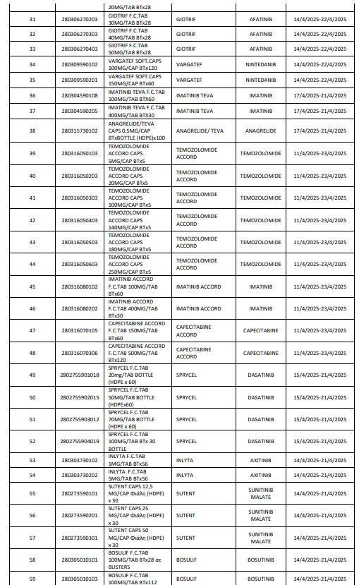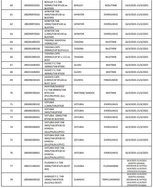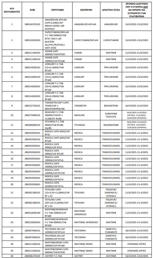 Θέτουμε υπόψιν σας ότι κατά την εορταστική περίοδο του Πάσχα και λόγω αδυναμίας ορισμένων φαρμακευτικών και μεταφορικών εταιρειών, η διεκπεραίωση αιτημάτων για χορήγηση Φαρμάκων Υψηλού Κόστους από ιδιωτικά φαρμακεία που υποβάλλονται μέσω της πλατφόρμας θα είναι δυνατή σύμφωνα με τον παρακάτω πίνακα.