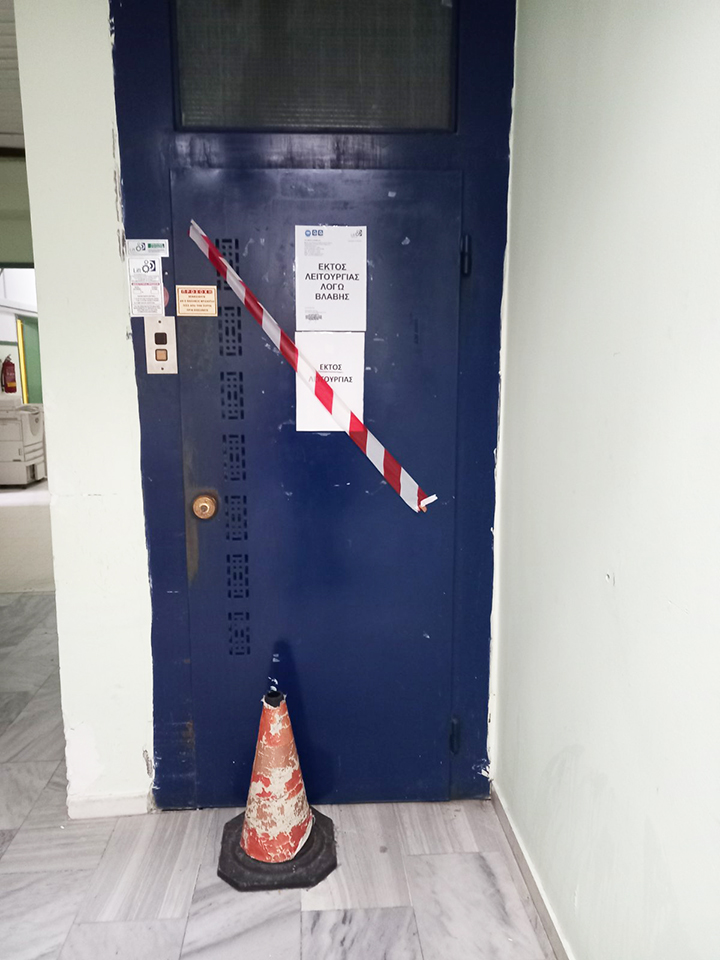 Τους τελευταίους επτά μήνες - από τον Σεπτέμβριο του 2024 - ένας κώνος, μια κορδέλα και δύο χαρτιά κολλημένα στην πόρτα του ανελκυστήρα ασθενών και συνοδών στο κεντρικό κτίριο του Νοσοκομείου - Κέντρου Υγείας Γουμένισσας Κιλκίς, ενημερώνουν το κοινό ότι βρίσκεται εκτός λειτουργίας λόγω σοβαρής βλάβης.