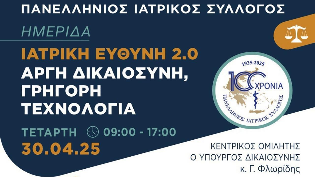 Στο πλαίσιο του εορτασμού των 100 χρόνων από την ίδρυσή του, ο Πανελλήνιος Ιατρικός Σύλλογος σας προσκαλεί σε μια Επιστημονική Ημερίδα που δεν μοιάζει με καμία άλλη: «Ιατρική Ευθύνη 2.0: Αργή Δικαιοσύνη, Γρήγορη Τεχνολογία».