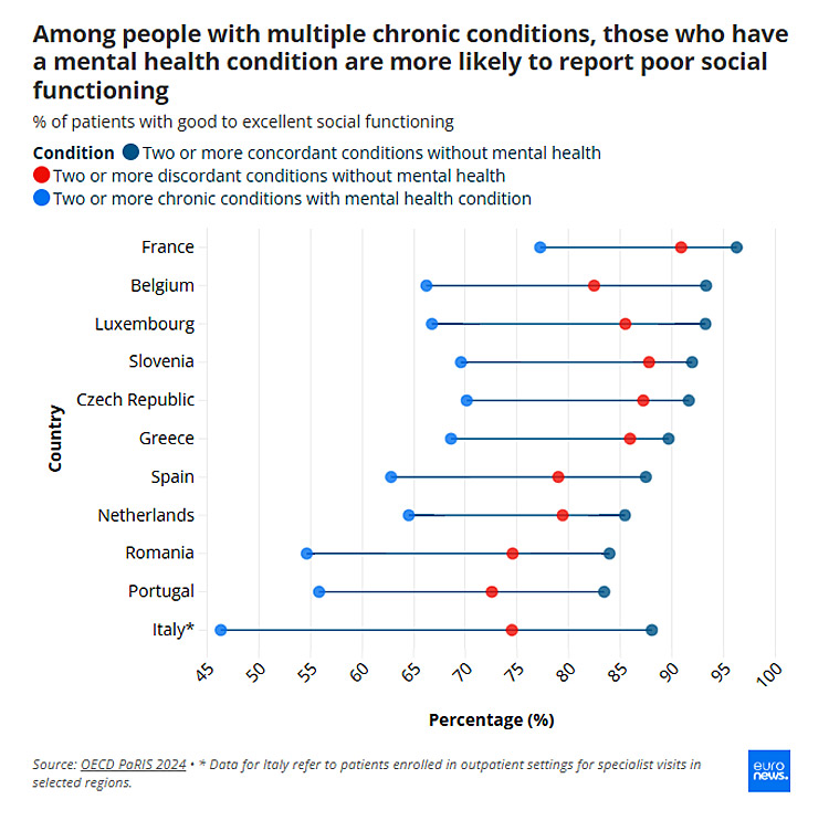 Η Γαλλία και η Τσεχική Δημοκρατία ανέφεραν το υψηλότερο ποσοστό ατόμων με δύο ή περισσότερες χρόνιες παθήσεις παράλληλα με ψυχικές παθήσεις, με 77,24% και 70,13% αντίστοιχα.