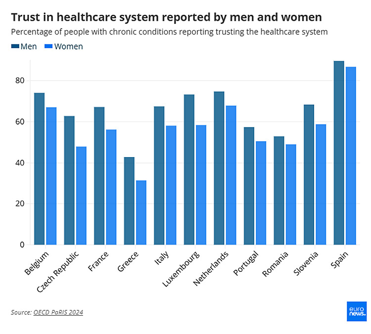 Το σχετικό ποσοστό στην Ελλάδα είναι 68,61% (με δύο οι περισσότερες χρόνιες παθήσεις και με ψυχικές ασθένειες), ενώ η σχέση εμπιστοσύνης που έχουν στο εθνικό σύστημα υγείας διαμορφώνεται στους μεν άνδρες στο 42,8% και στις γυναίκες στο 31,4%.