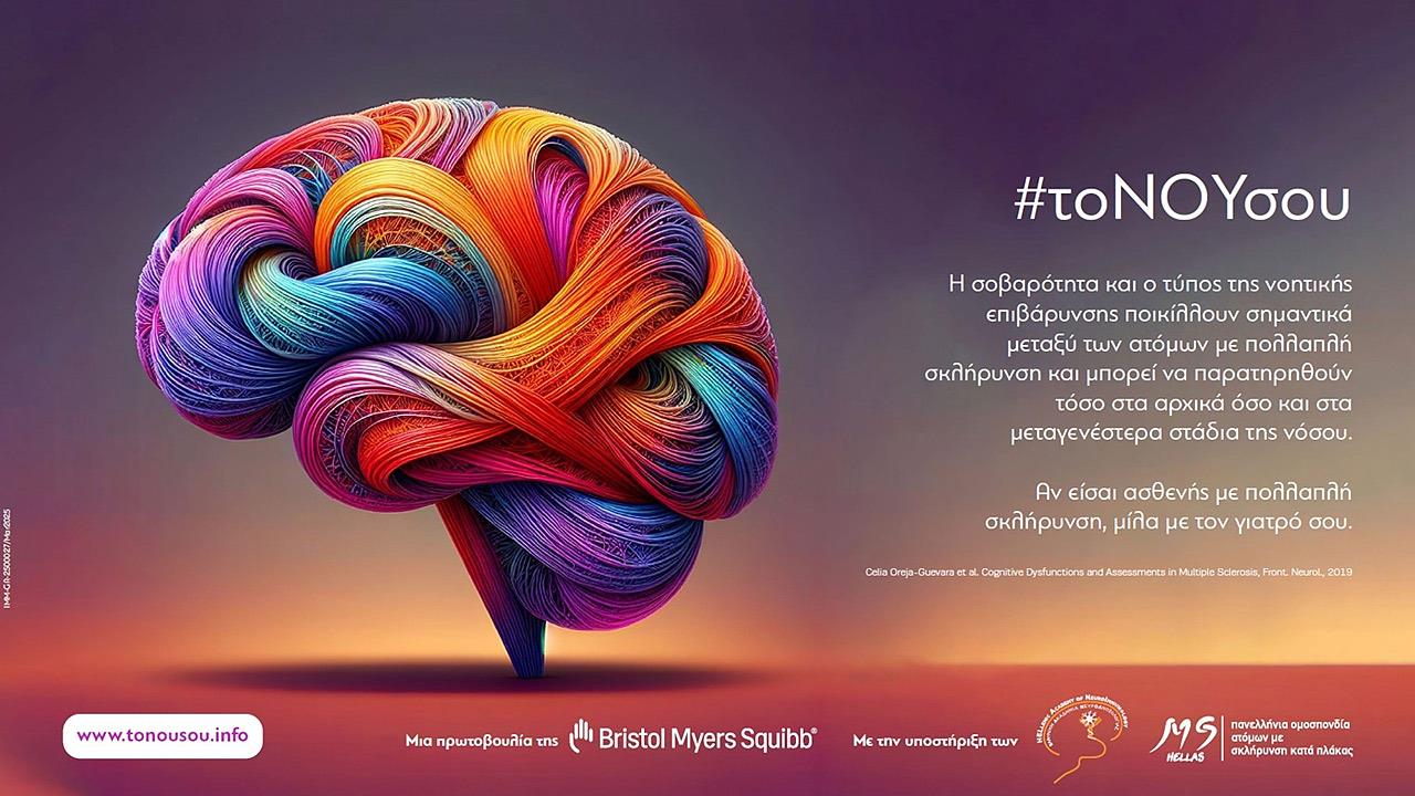 Με αφορμή την επικείμενη Παγκόσμια Ημέρα Πολλαπλής Σκλήρυνσης (30 Μαΐου), η Bristol Myers Squibb, Ελλάδας (BMS) ενεργοποιεί τη νέα εκστρατεία ενημέρωσης '#τοΝΟΥσου', ως μια παρότρυνση προς το ευρύ κοινό, τους ασθενείς με πολλαπλή σκλήρυνση αλλά και τους οικείους τους να ενημερωθούν, να αναγνωρίσουν πιθανά συμπτώματα και να αναζητήσουν, έγκαιρα, τη συμβουλή ενός εξειδικευμένου νευρολόγου, για την ορθή ιατρική αξιολόγηση και παρέμβαση.