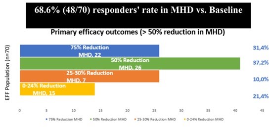 Σύμφωνα με τα ευρήματα, συνολικά 48 από τους 70 ασθενείς, ή ποσοστό 68,6%, είχαν από 50% ως και 75% μείωση των ημερών με κεφαλαλγία. Συγκεκριμένα: