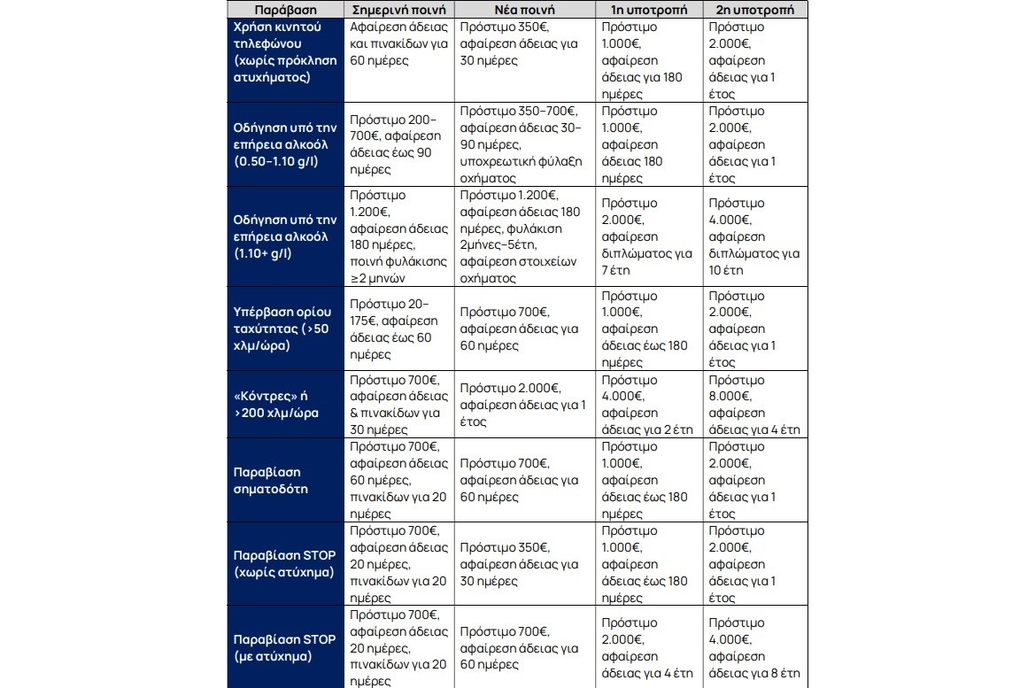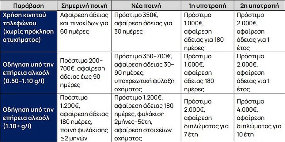 Ενδεικτικό παράδειγμα αυτής της νέας δομής ποινών αποτελεί η αντιμετώπιση της χρήσης κινητού τηλεφώνου, που το 2024 ήταν η 3η αιτία πρόκλησης τροχαίων στην Ελλάδα. Σήμερα, ανεξαρτήτως της πρόκλησης ατυχήματος, η χρήση κινητού επισύρει αφαίρεση άδειας οδήγησης και πινακίδων για 60 ημέρες.
