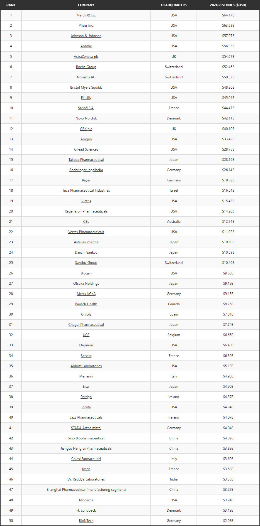 Καθιερωμένοι γίγαντες όπως η Johnson &; Johnson (έσοδα φαρμακευτικών προϊόντων 57,07 δισεκατομμυρίων δολαρίων), η AbbVie (56,33 δισεκατομμύρια δολάρια) και η AstraZeneca (54,07 δισεκατομμύρια δολάρια), ολοκληρώνουν τις πέντε πρώτες θέσεις.