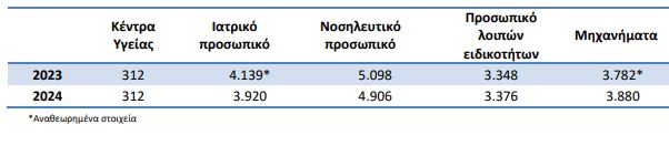 Όπως φαίνεται στον πίνακα που ακολουθεί, το αριθμός των γιατρών ήταν μειωμένος κατά 219 άτομα και του νοσηλευτικού προσωπικού κατά 192 άτομα σε σχέση με το 2023.