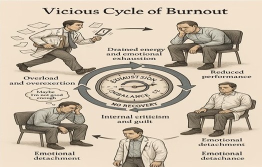 - Έτσι ο κύκλος επαναλαμβάνεται: το άτομο προσπαθεί να αντισταθμίσει με ακόμη περισσότερη δουλειά, χωρίς όμως να υπάρχει ουσιαστική ανάρρωση.