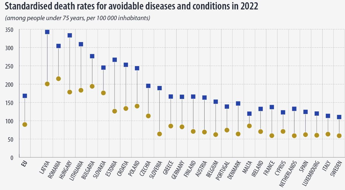 Σύμφωνα με τους συντάκτες της έκθεσης, το 2022 καταγράφηκαν στην Ευρωπαϊκή Ένωση 1,1 εκατομμύριο θάνατοι σε άτομα κάτω των 75 ετών, οι οποίοι θα μπορούσαν να έχουν αποτραπεί.