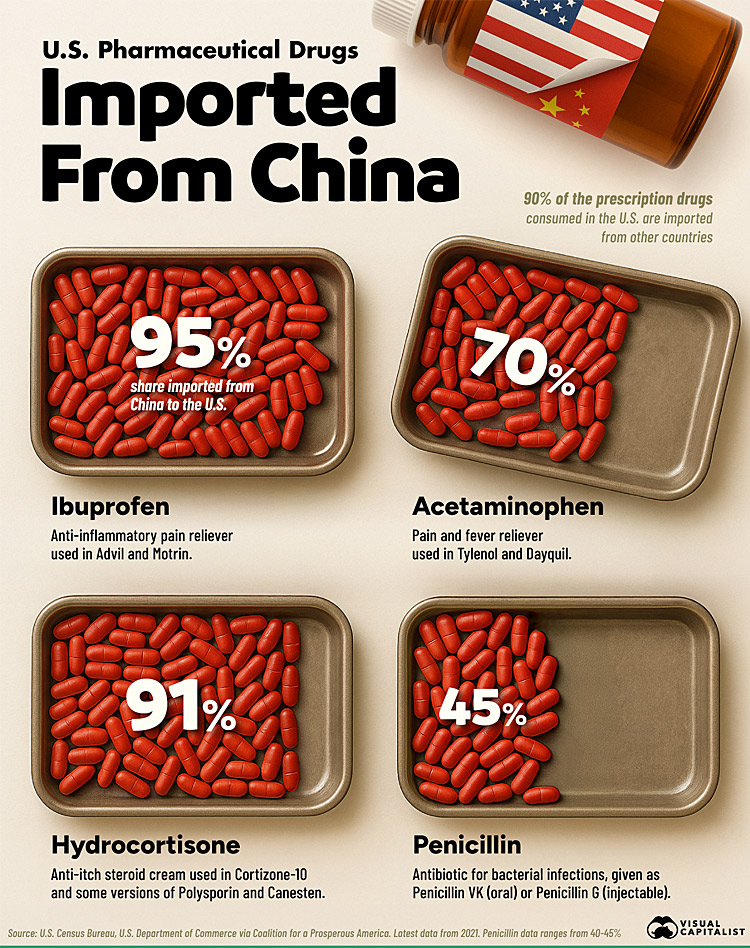 "Η Κίνα είναι ο προμηθευτής του 95% των εισαγωγών ιβουπροφαίνης στις ΗΠΑ και του 70% των εισαγωγών ακεταμινοφαίνης. Περίπου το 90% των φαρμάκων που συνταγογραφούνται στις ΗΠΑ εισάγονται από άλλες χώρες."