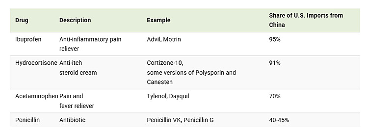Ειδικότερα, προμηθεύει το 95% των εισαγωγών ιβουπροφαίνης στις ΗΠΑ, η οποία χρησιμοποιείται σε μη συνταγογραφούμενα φάρμακα όπως το Advil και το Motrin. Ομοίως, το 70% των εισαγωγών ακεταμινοφαίνης στις ΗΠΑ (που χρησιμοποιείται στο Tylenol και το DayQuil) προέρχεται από την Κίνα. Επιπλέον, η Κίνα αντιπροσωπεύει το 91% των εισαγωγών υδροκορτιζόνης των ΗΠΑ. Η υδροκορτιζόνη είναι το φαρμακευτικό παρασκεύασμα της ορμόνης κορτιζόλης και χρησιμοποιείται για τη θεραπεία αλλεργιών και φλεγμονών. Η πενικιλίνη, ένα ευρέως χρησιμοποιούμενο αντιβιοτικό, εισάγεται επίσης κυρίως από Κινέζους παραγωγούς.